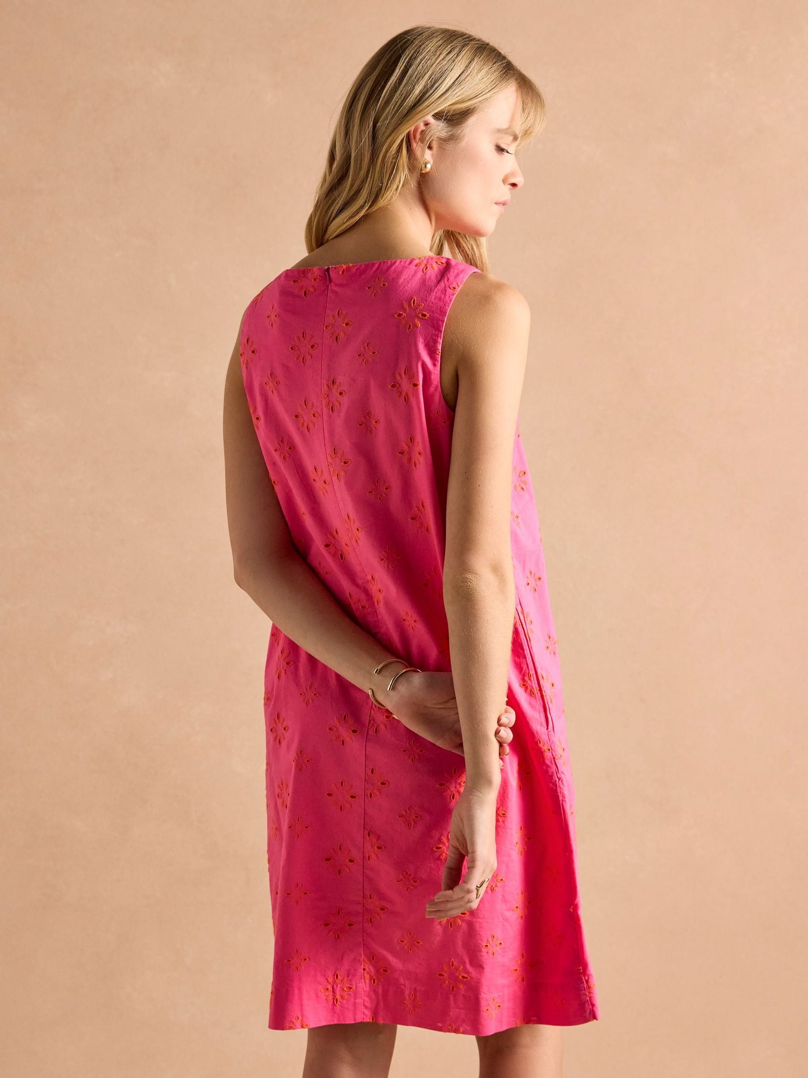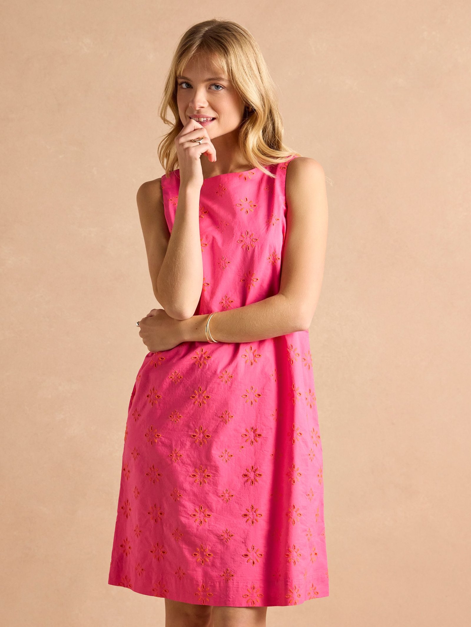 With its distinctive shape and effortless feel, the shift dress has been a resident in women’s wardrobes for decades. The Delphine defines summer style, with its knee length, sleeveless design and light viscose and linen blend fabric. It has a classic boat neck, a concealed zip fastening to the centre back and comes in an assortment of prints and colour blocks to choose from. Wear with a pair of pumps or sandals for an effortless look that always delivers on style. Viscose and linen blend. Shift-style dress. Knee length. Boat neck. Sleeveless design. Concealed zip fastening to the centre back.
