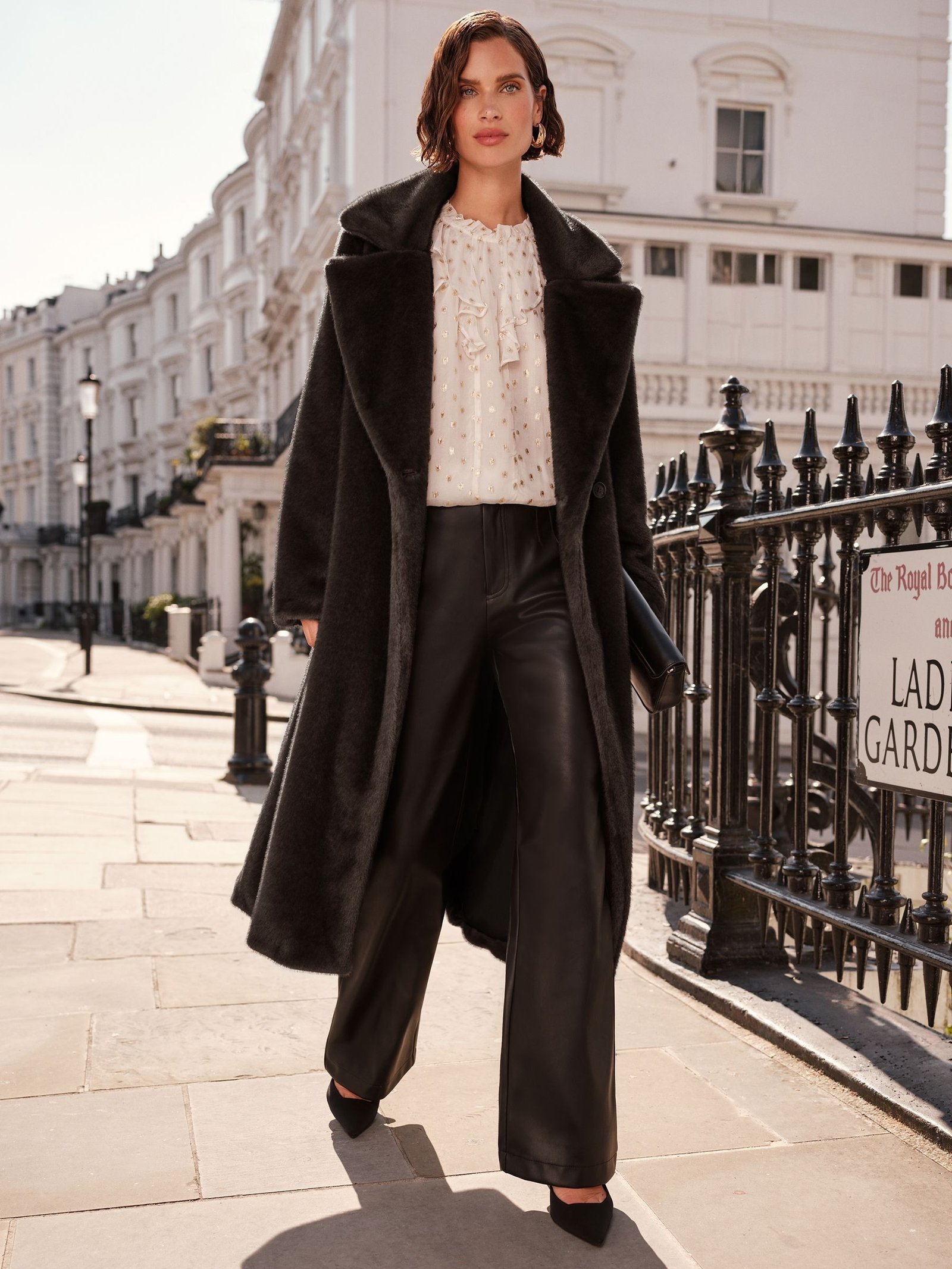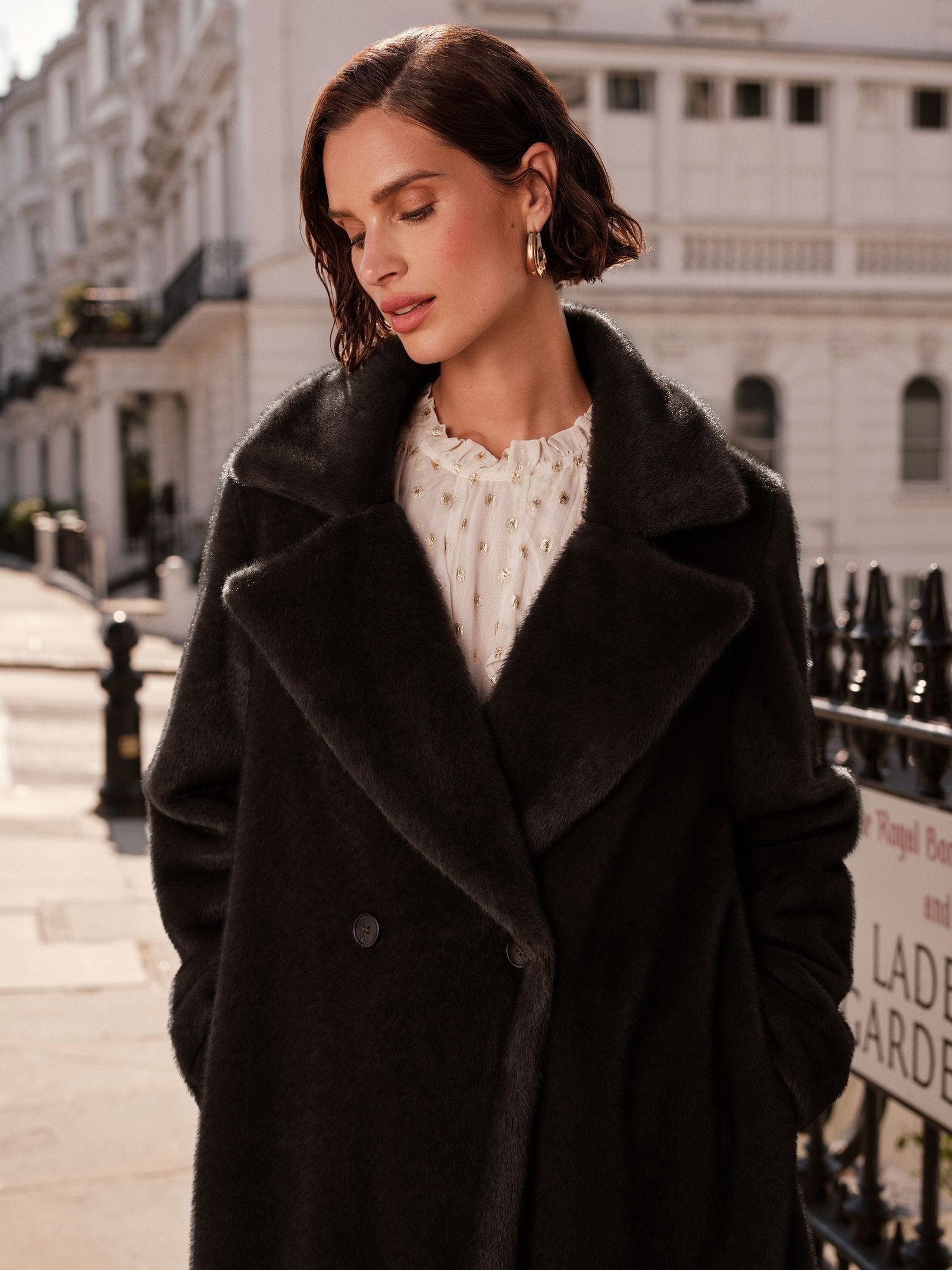 Elevate your winter wardrobe with this Longline Faux Fur Double-Breasted Coat, crafted from ultra-soft, high-quality faux fur. The longline silhouette offers a flattering fit. Featuring a notched lapel collar, horn button closures, and deep side pockets for practicality. It pairs seamlessly with everything from casual denim to evening wear, making it a must-have addition to your cold-weather collection.