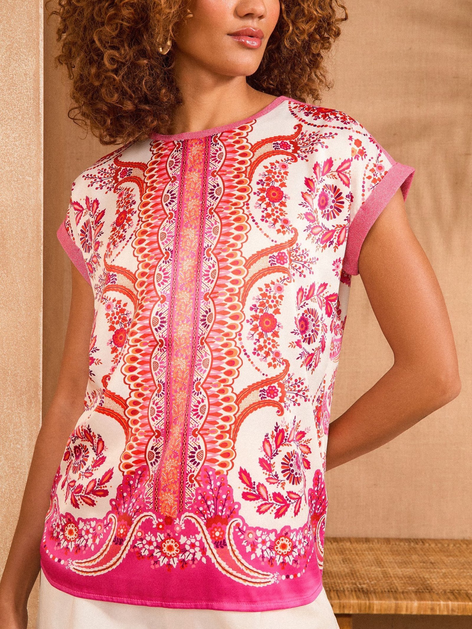 Features : Printed satin front, jersey back, crew neck, mix of textures