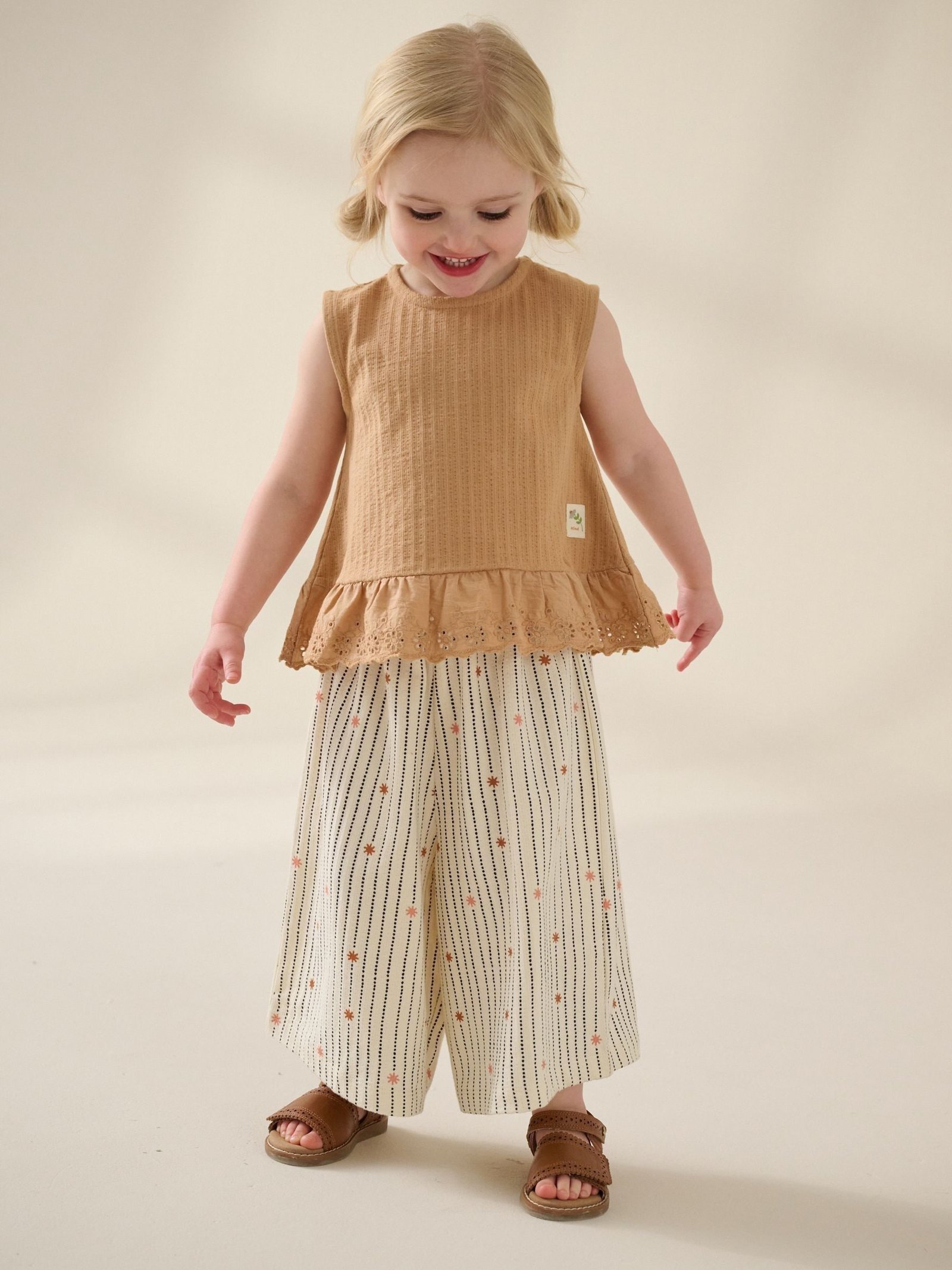 This 2-piece set is perfect for summer dressing, featuring a pure cotton vest top with frill detailing to the hem and a textured feel, alongside a pair of wide-leg leggings finished with an elasticated waistband for easy wear.2-piece set100% cotton vest topFrill hemWide leg leggingsElasticated waistband