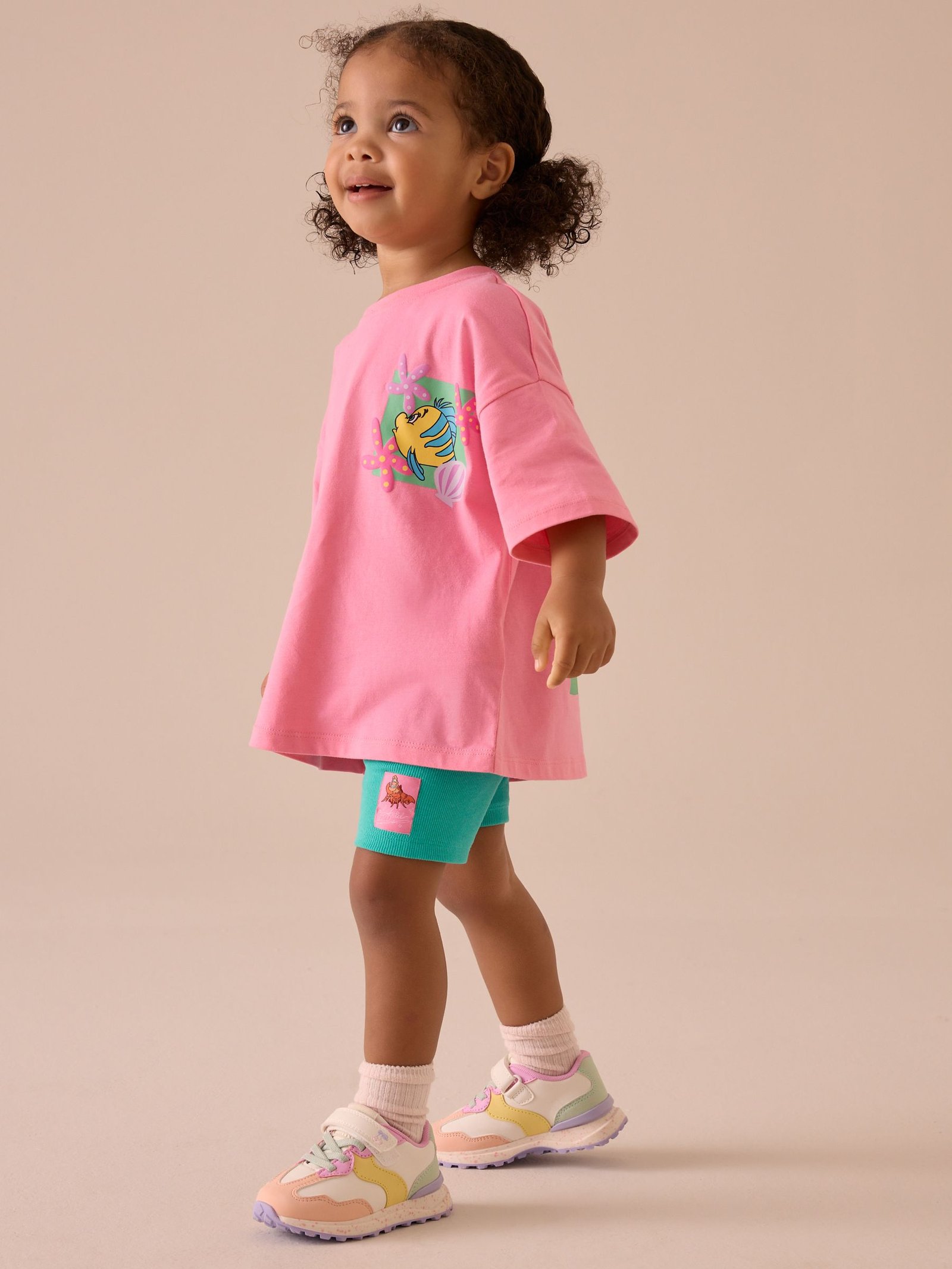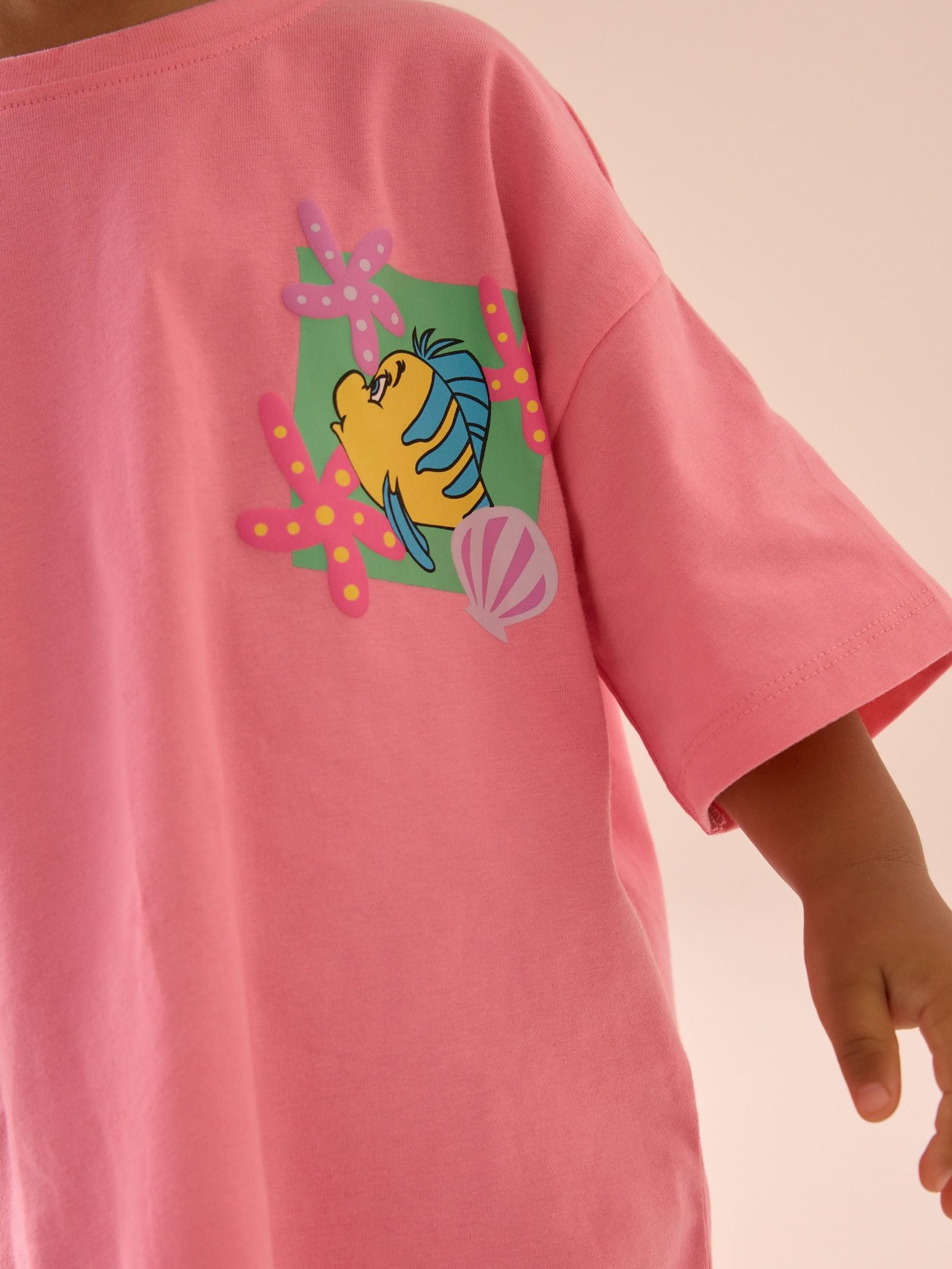 Get them summer ready with the ultimate laidback combo. This 2-piece set features a comfortable cotton t-shirt in a bright pink hue with officially licensed Little Mermaid graphics to the chest and back, alongside a pair of turquoise cycle shorts made from a stretchy cotton-blend.2-piece set100% cotton t-shirtLittle Mermaid graphicsCotton-blend cycle shortsContrast patch