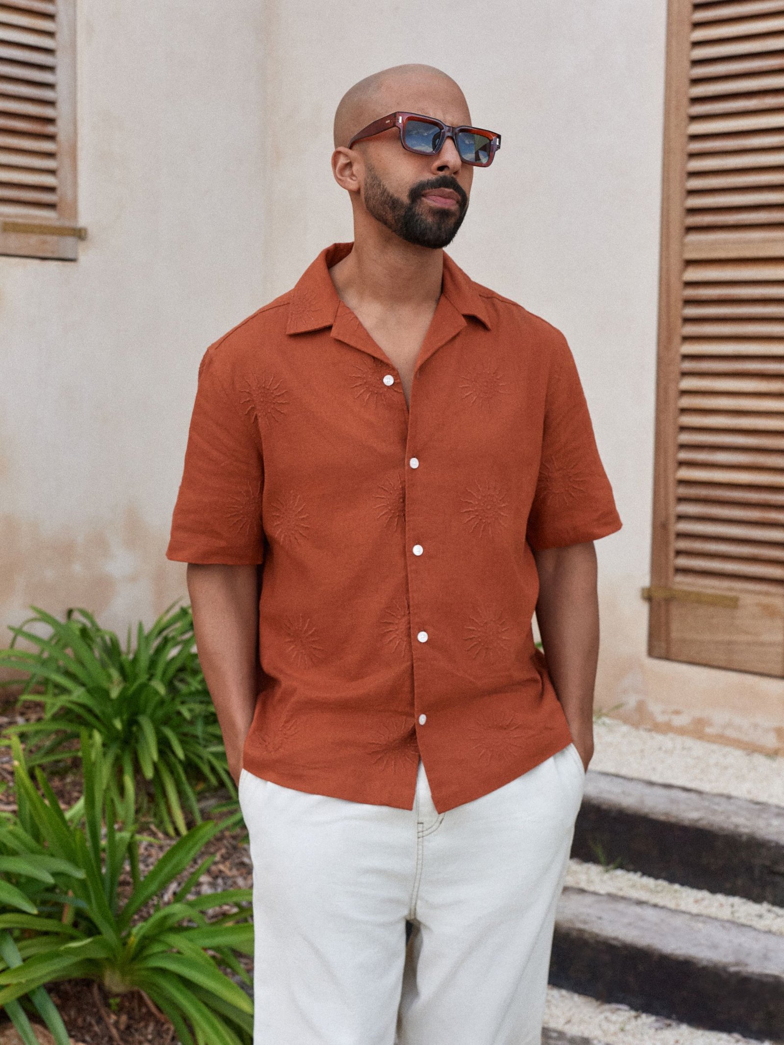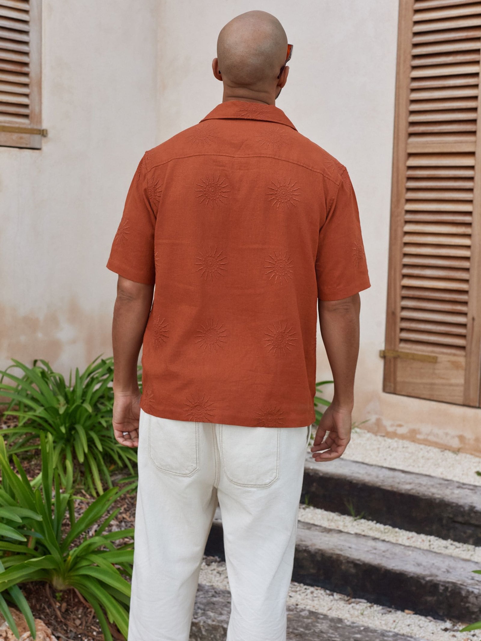 Features : Sun embroidery detail, button-down shirt, short sleeves
