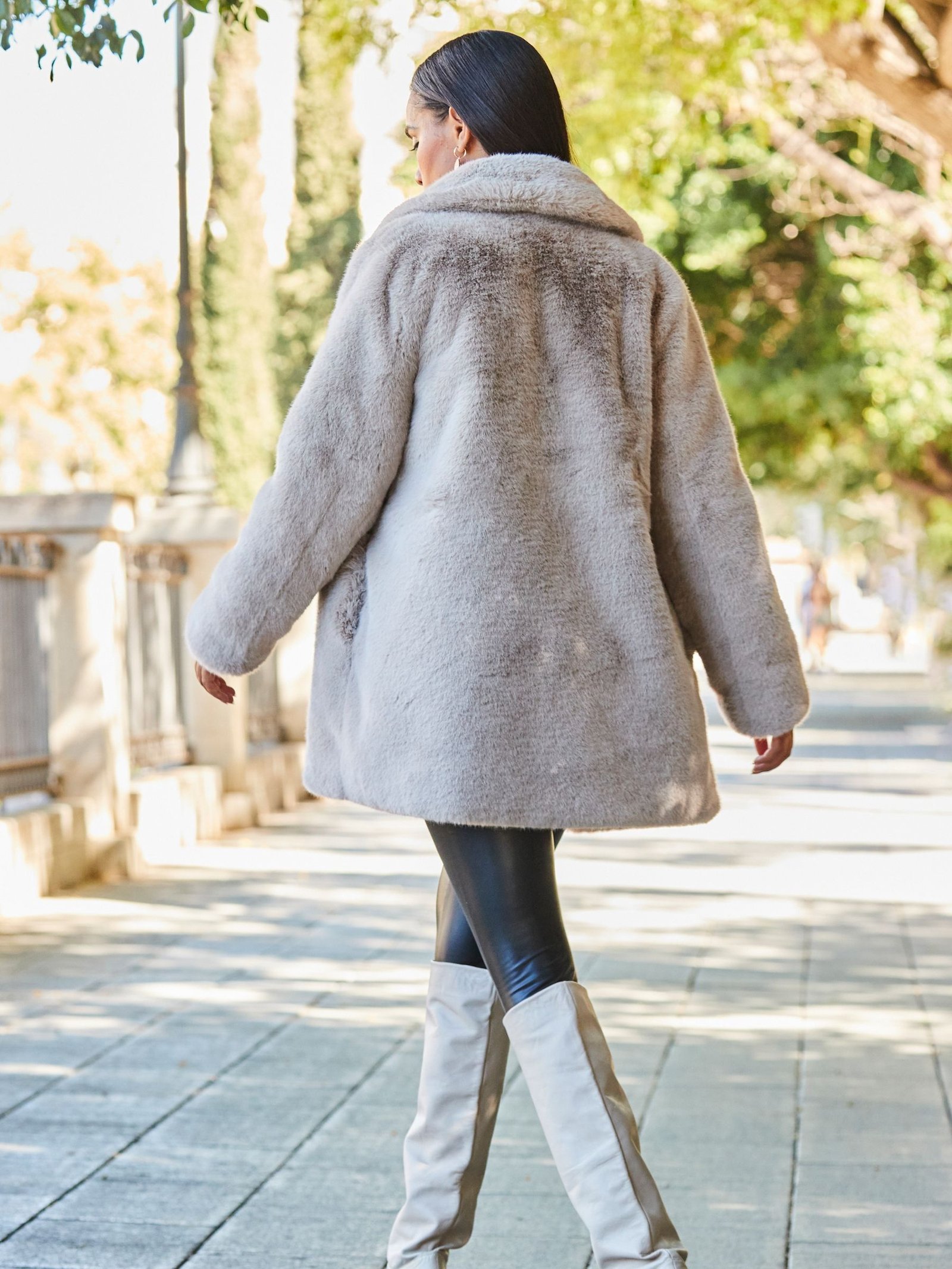 Snug meets stylish, crafted from the softest faux fur, on-trend chocolate hue, flattering hem length, up the going-out glam factor, elevate jeans and a jumper. The model is 5ft 9” and wears a UK size 8.