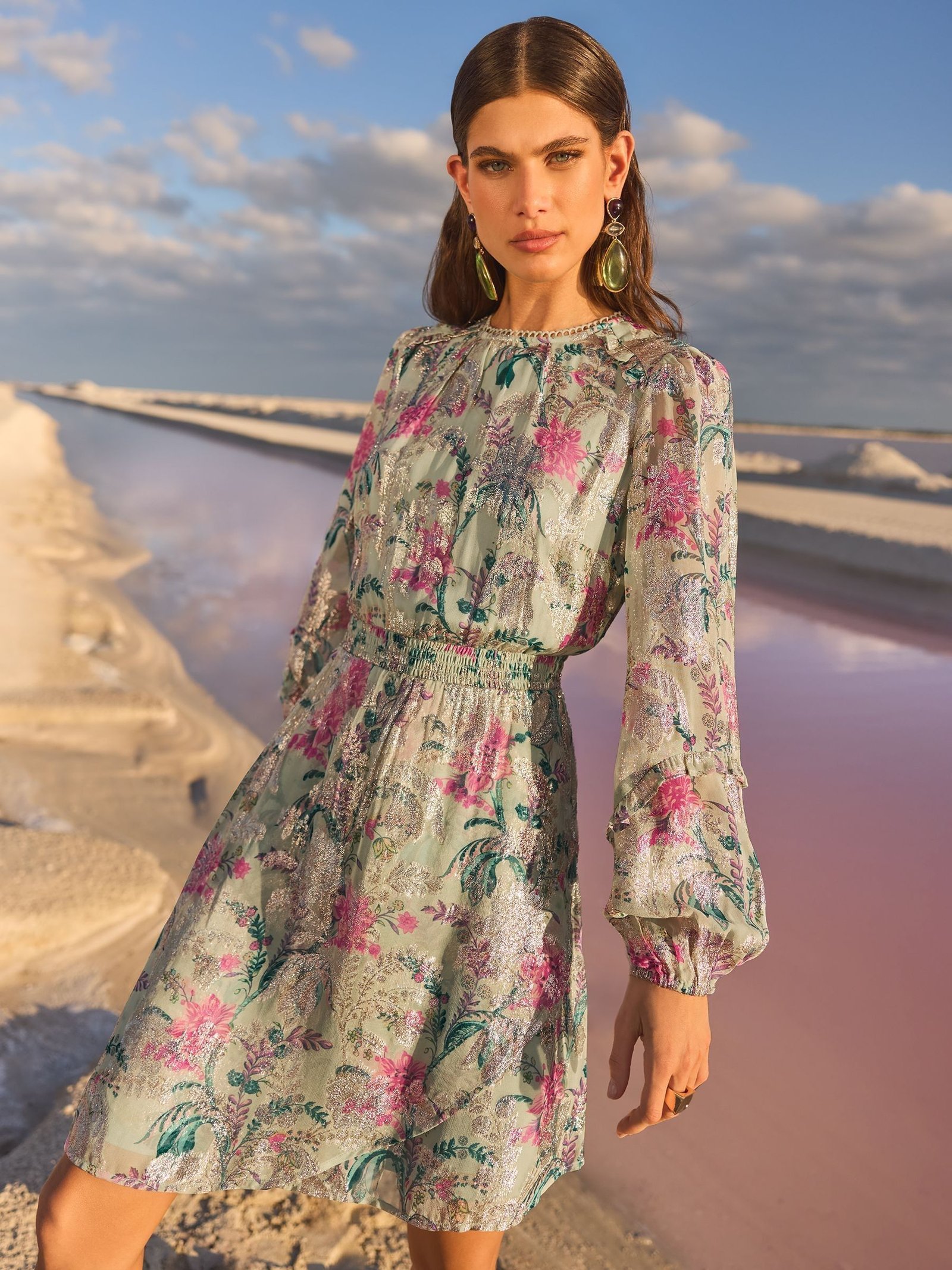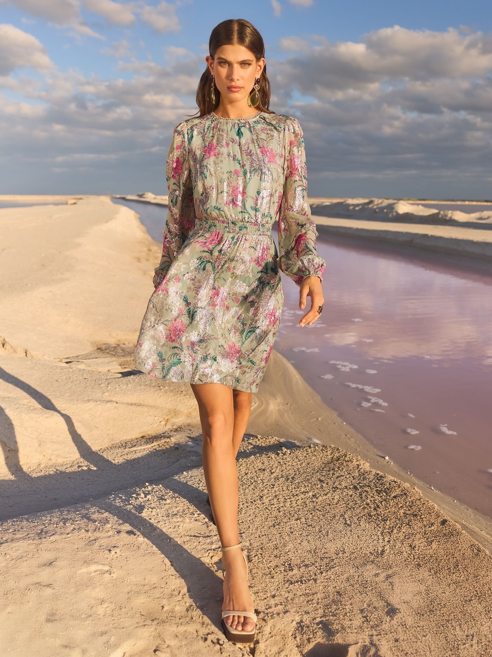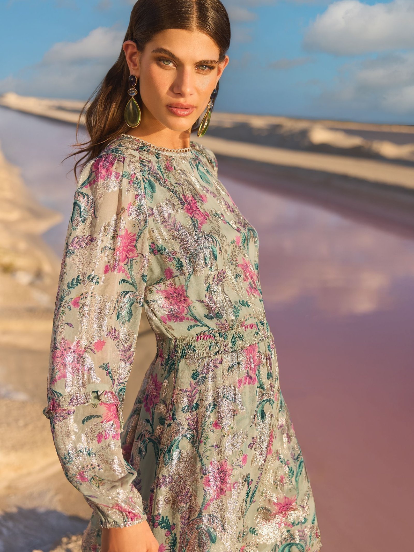 Stunning metallic floral mini dress with ruffle detail on the sleeves. Elasticated shirred waist and a crew neckline with lace trim detail.